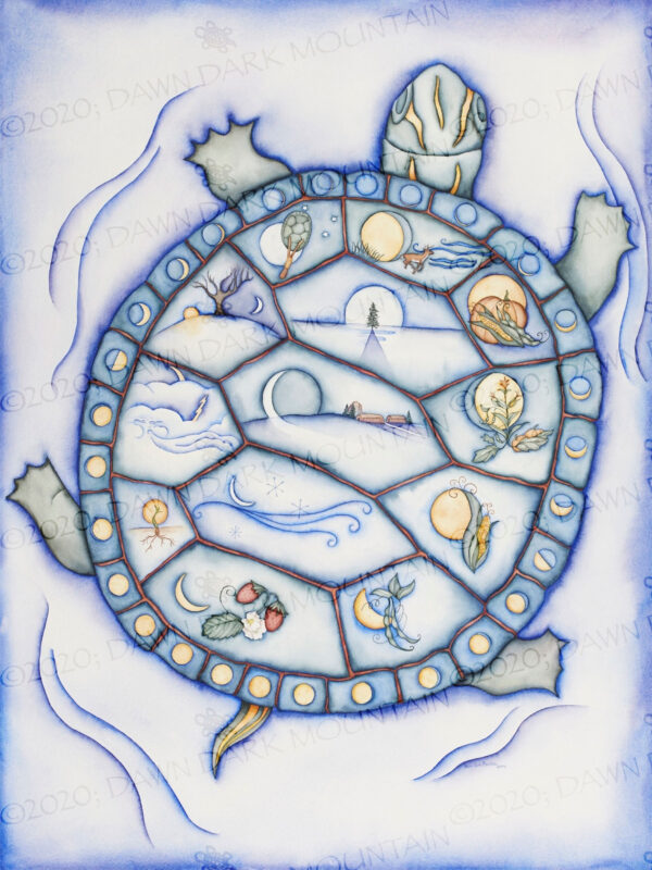 The Iroquois (traditionally Haudenosaunee) people see the cycle of life in all of our ceremonies and thanksgivings. Turtle’s shell is our calendar with its pattern of 13 large plates representing the thirteen moons in each year & 28 smaller plates showing the 28 days from one new moon to the next. We say that the Moon is our Grandmother and she has 13 names in the course of a year, they are: